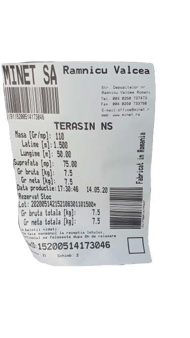 Terasin NS este confectionat din fibre 100% poliester, are o densitate de 110 gr/mp, cu latimea de 1,5 m si lungimea de 100 m.