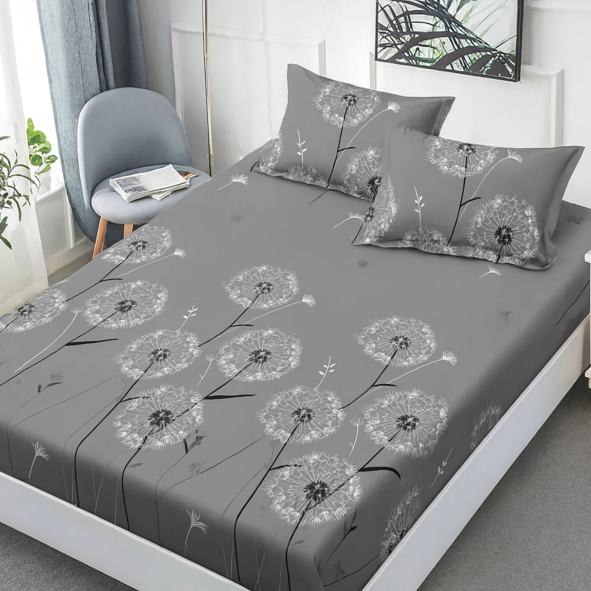 Husa de pat Finet + 2 fete de perna, pentru saltea de 160×200 cm, Papadii gri