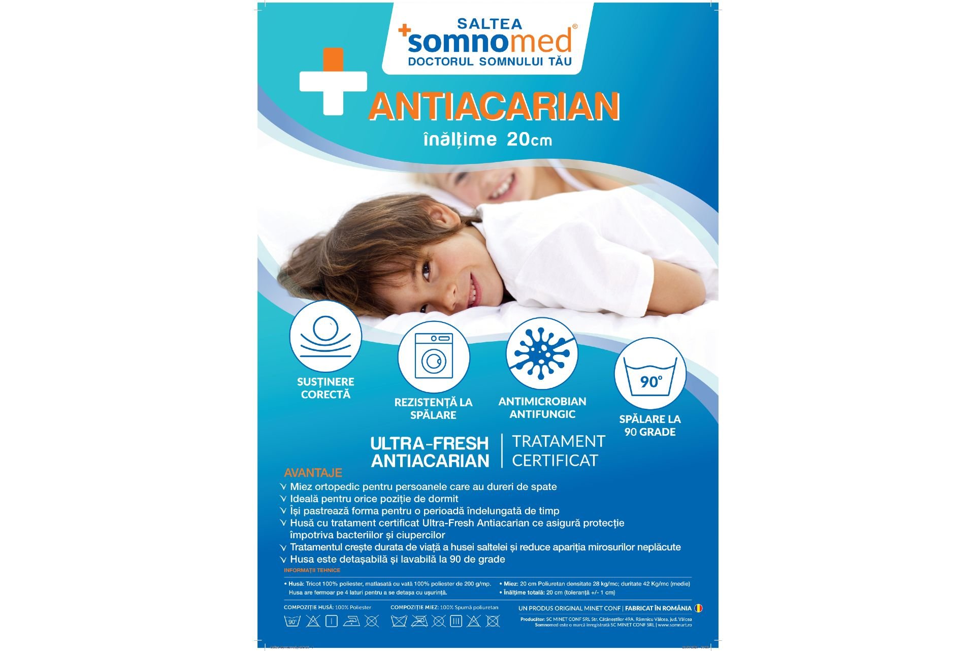 Saltea Somnomed Antiacaria pentru alergici, husa detasabila si lavabila cu tratament antiacarian 120×200